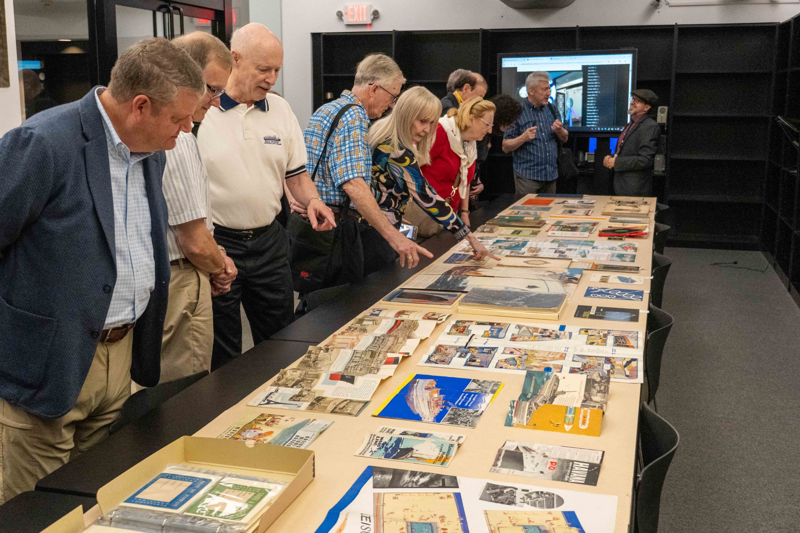 PONY Branch members examining a curated sample of the museum’s extensive collection of ocean liner and cruise ship memorabilia that was put on display for our visit.