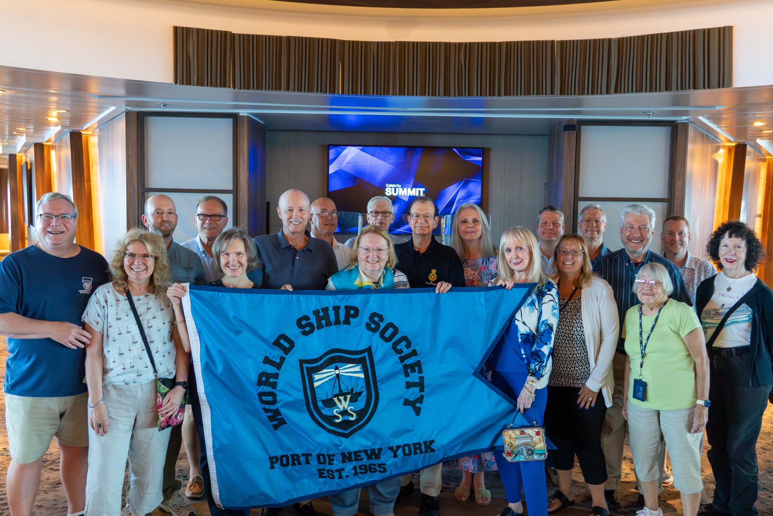 Cruise attendees in the Rendezvous Lounge onboard the CELEBRITY SUMMIT behind the new PONY Branch burgee in honor of our 60th Anniversary.