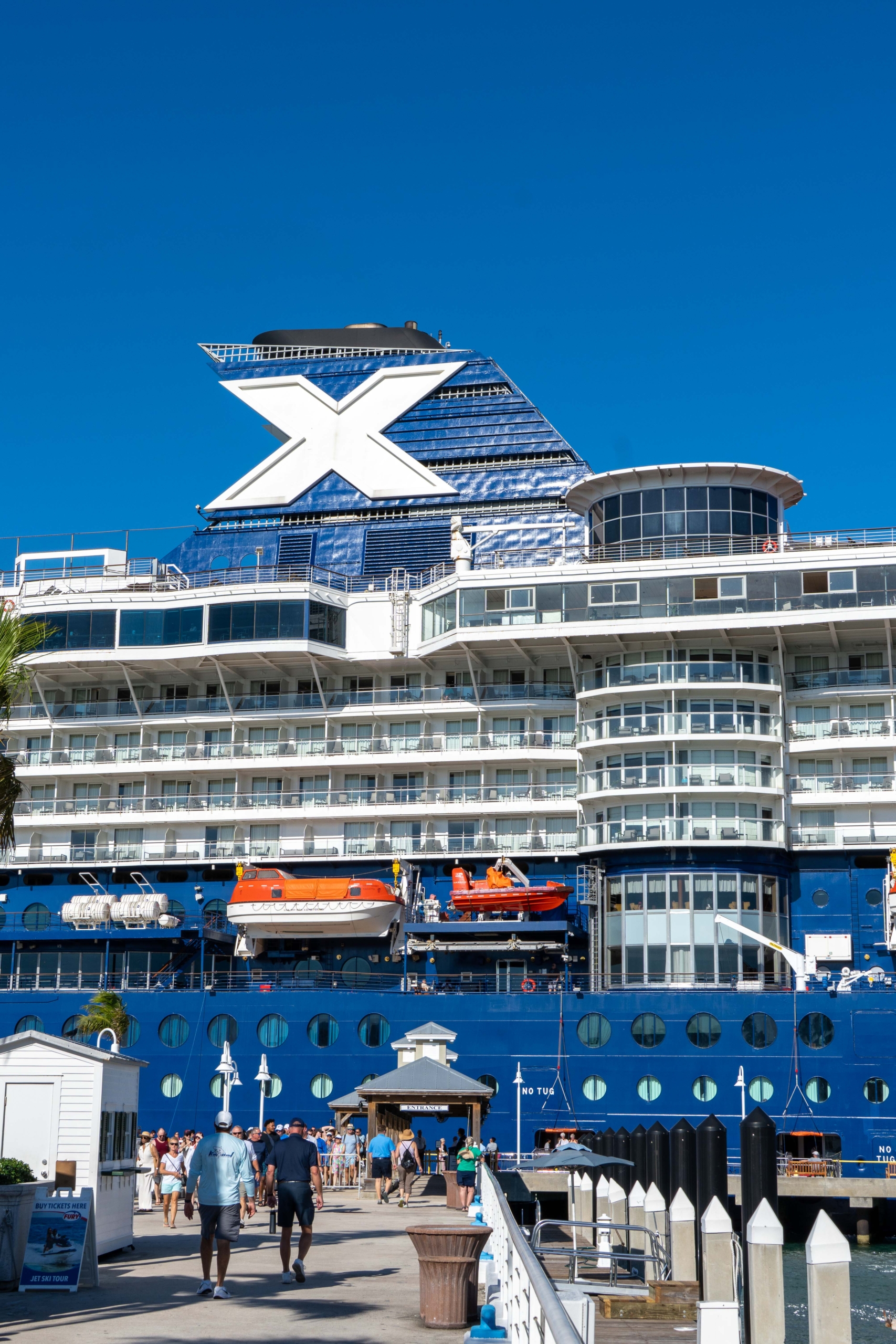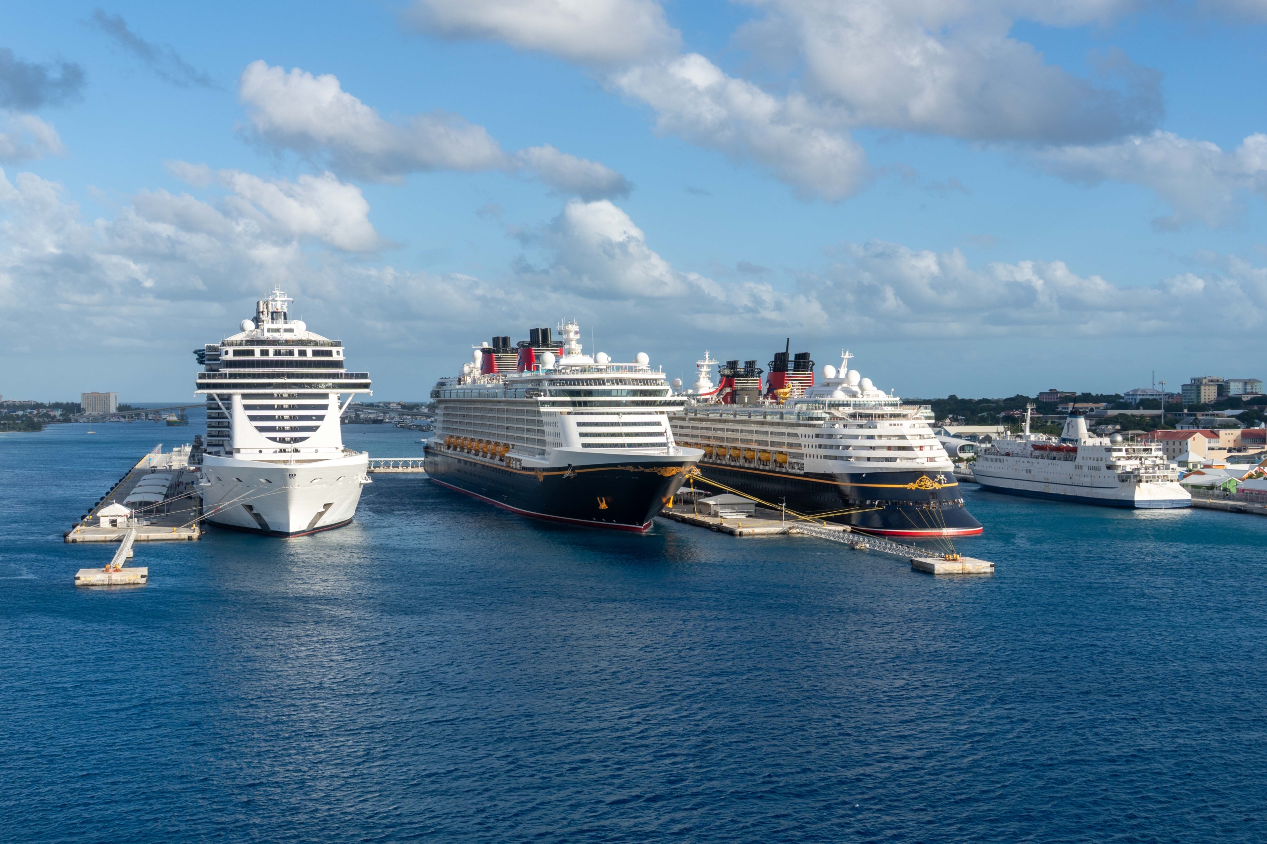 View of the port of Nassau in the Bahamas from the departing CELEBRITY SUMMIT. From left: MSC SEASCAPE, DISNEY DREAM, DISNEY MAGIC and the MV LOGOS HOPE, originally built in 1973 as the car ferry GUSTAV VASA and now serving as a floating book fair and community outreach platform.