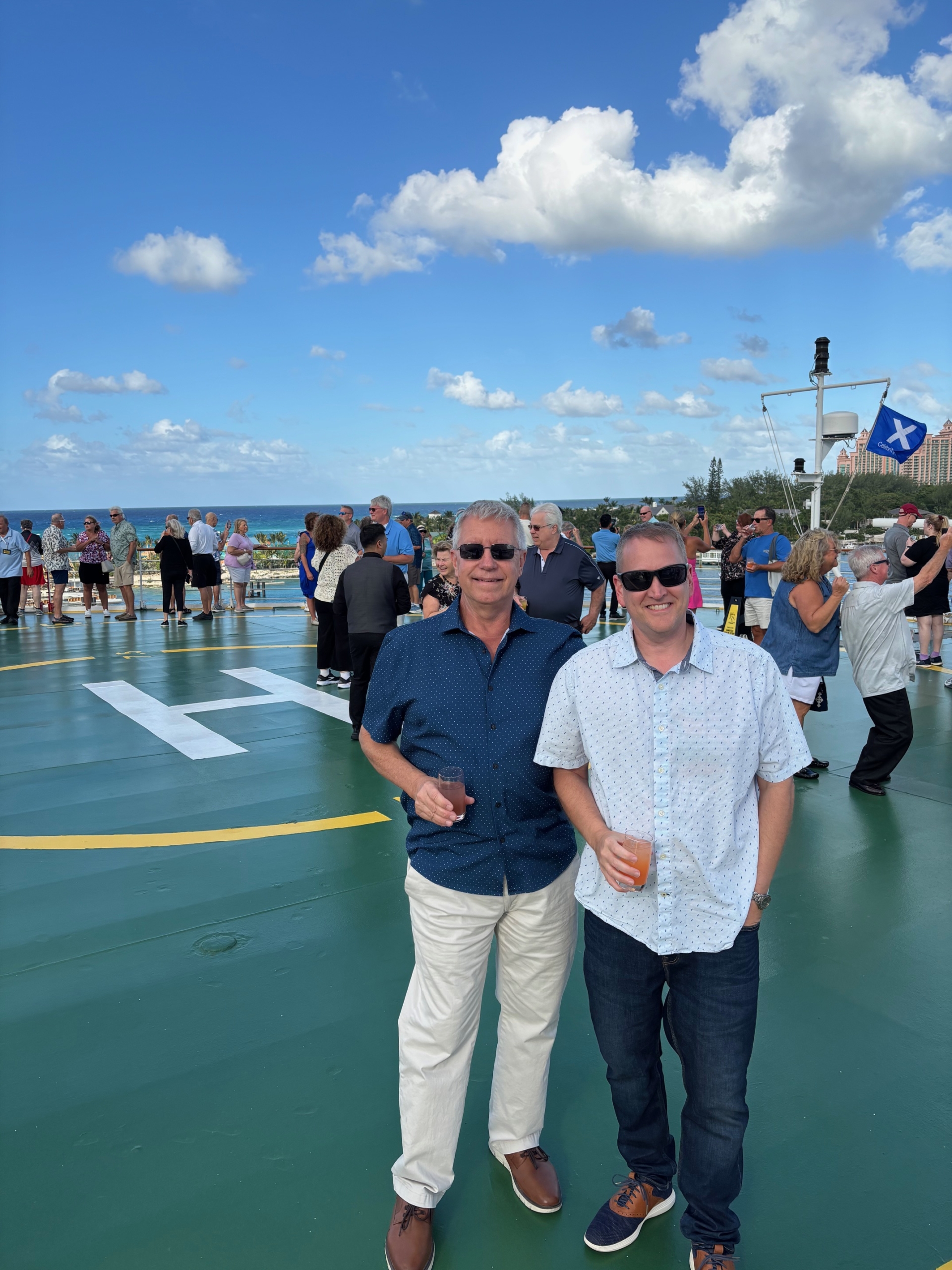 PONY Branch members Rich Turnwald and Matt Rihl enjoying the festivities on the bow of the CELEBRITY SUMMIT during the sail away from Nassau.